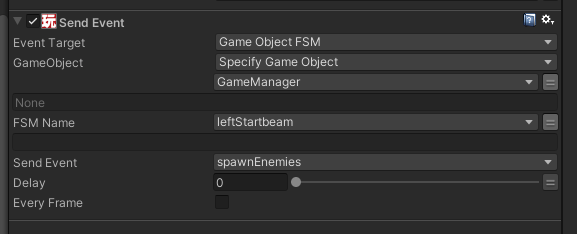 On the Send Event, choose Game Object FSM, Specify Game Object, and here enter the object variable name that you created in the Find Game Object in your Start state.