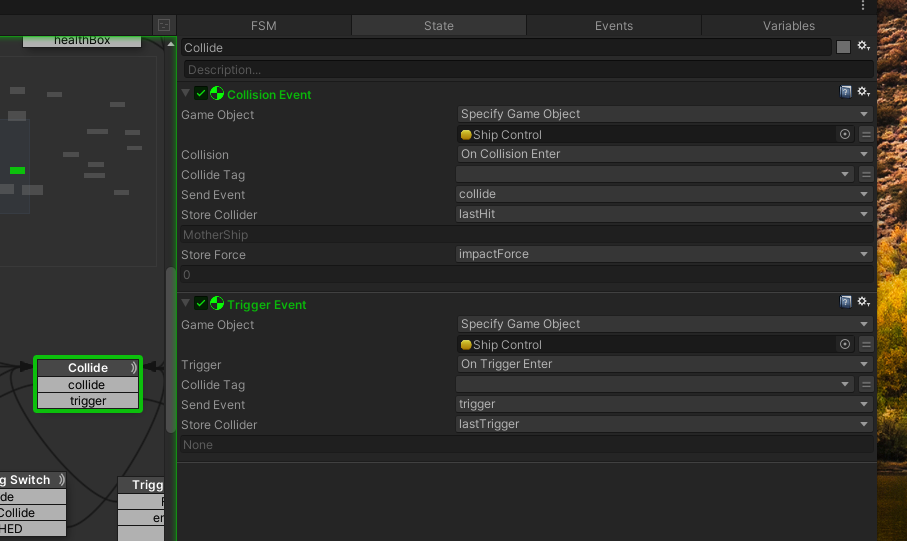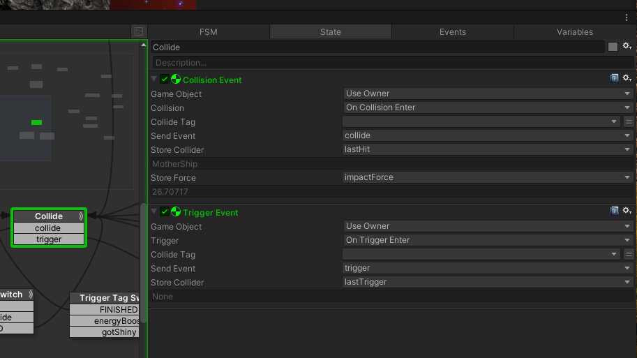 In the original set-up I have the 'health FSM' on the player spaceship, which is rigid body/colliders etc, and upon a collision I use the Store Force on the Collision Event action to calculate how much damage is done to the spaceship, depending how fast you collide with something: