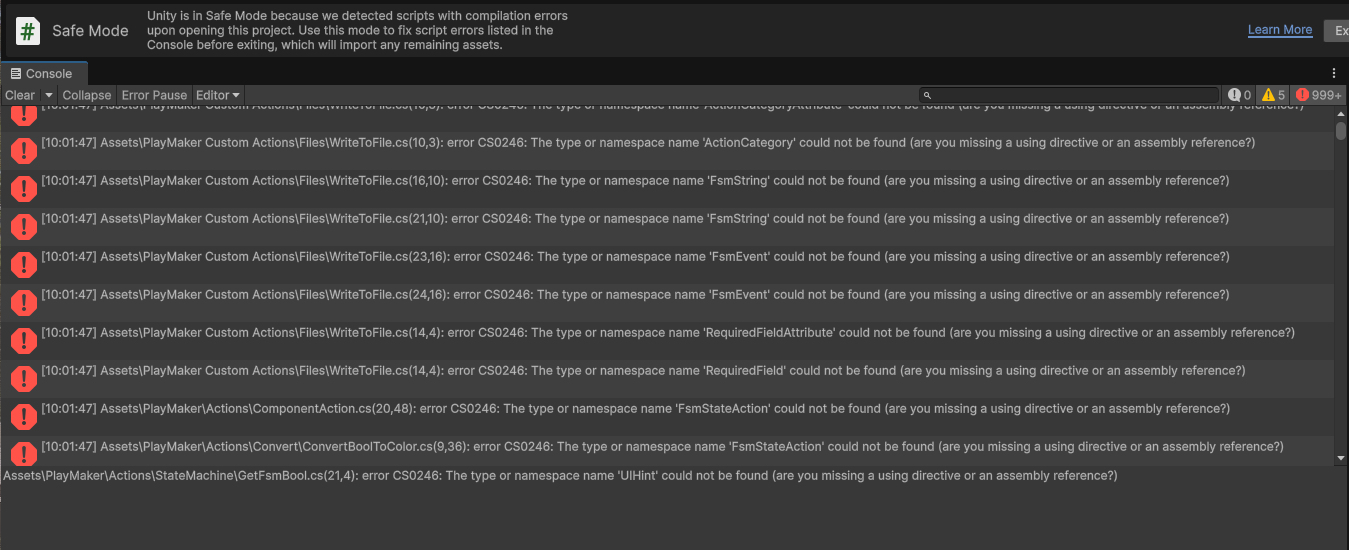 Hello, I have installed PlayMaker 1.9.8f1 (the latest) on Unity 6.0000.0.27f1 (Mac Silicon), and I have only encountered the following issues during the installation, but otherwise, it works fine.